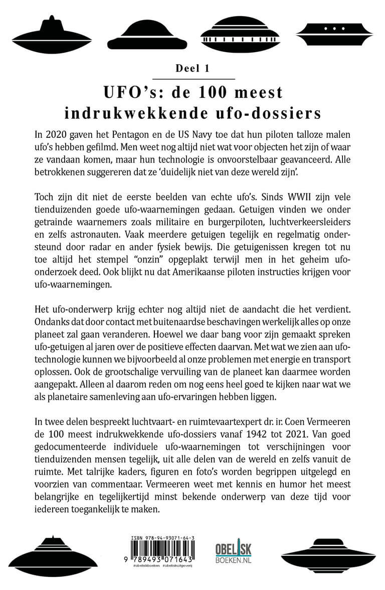 In een boek in twee delen bespreekt luchtvaart- en ruimtevaartexpert Coen Vermeeren de 100 meest indrukwekkende ufo-dossiers van de afgelopen bijna tachtig jaar – van 1942 tot 2020. Van goed gedocumenteerde individuele waarnemingen tot ufo-verschijningen voor tienduizenden mensen tegelijk. Waarnemingen in alle delen van de wereld en zelfs vanuit onze ruimteschepen. Met talrijke kaders, figuren en foto’s worden begrippen uitgelegd en voorzien van commentaar. Vermeeren weet met kennis en humor het meest serieuze en tegelijkertijd minst bekende, maar belangrijkste onderwerp van deze tijd voor iedereen toegankelijk te maken.