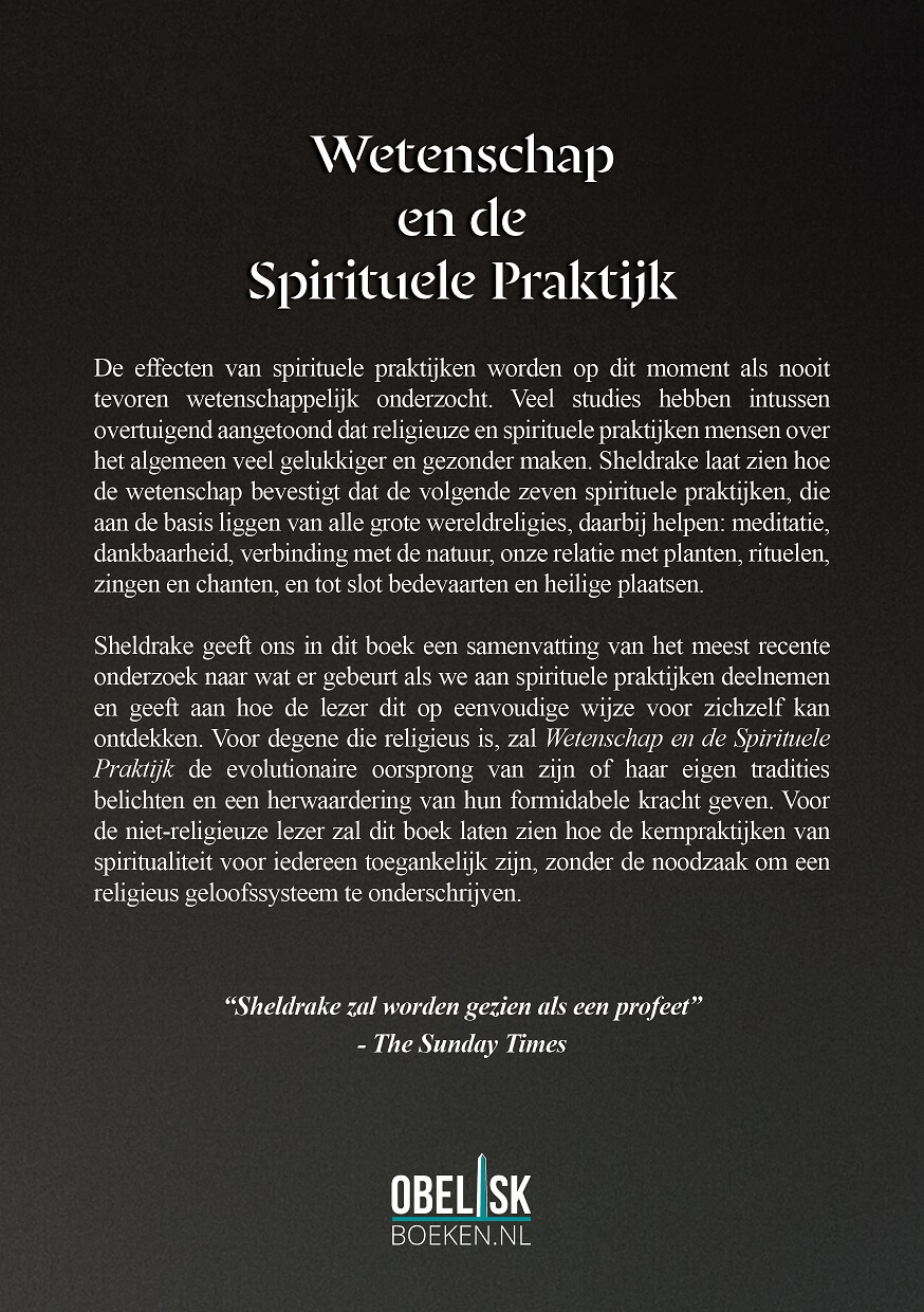 Sheldrake geeft ons in dit boek een samenvatting van het meest recente onderzoek naar wat er gebeurt als we aan spirituele praktijken deelnemen en geeft aan hoe de lezer dit op eenvoudige wijze voor zichzelf kan ontdekken. Voor degene die religieus is, zal Wetenschap en de Spirituele Praktijk de evolutionaire oorsprong van zijn of haar eigen tradities belichten en een herwaardering van hun formidabele kracht geven. Voor de niet-religieuze lezer zal dit boek laten zien hoe de kernpraktijken van spiritualiteit voor iedereen toegankelijk zijn, zonder de noodzaak om een religieus geloofssysteem te onderschrijven.