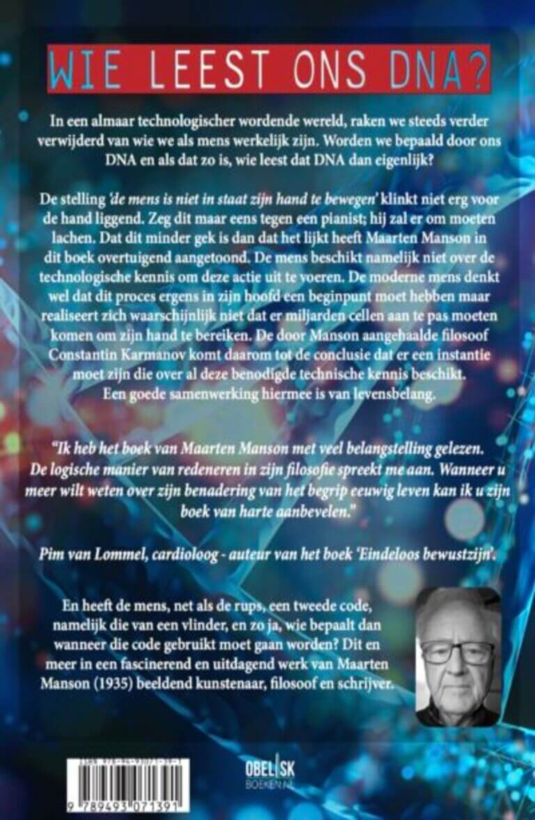 In een almaar technologischer wordende wereld, raken we steeds verder verwijderd van wie we als mens werkelijk zijn. Worden we bepaald door ons DNA en als dat zo is, wie leest dat DNA dan eigenlijk? De stelling ‘de mens is niet in staat zijn hand te bewegen’ klinkt niet erg voor de hand liggend. Zeg dit maar eens tegen een pianist; hij zal er om moeten lachen. Dat dit minder gek is dan dat het lijkt heeft Maarten Manson in dit boek overtuigend aangetoond. De mens beschikt namelijk niet over de technologische kennis om deze actie uit te voeren. De moderne mens denkt wel dat dit proces ergens in zijn hoofd een beginpunt moet hebben maar realiseert zich waarschijnlijk niet dat er miljarden cellen aan te pas moeten komen om zijn hand te bereiken.